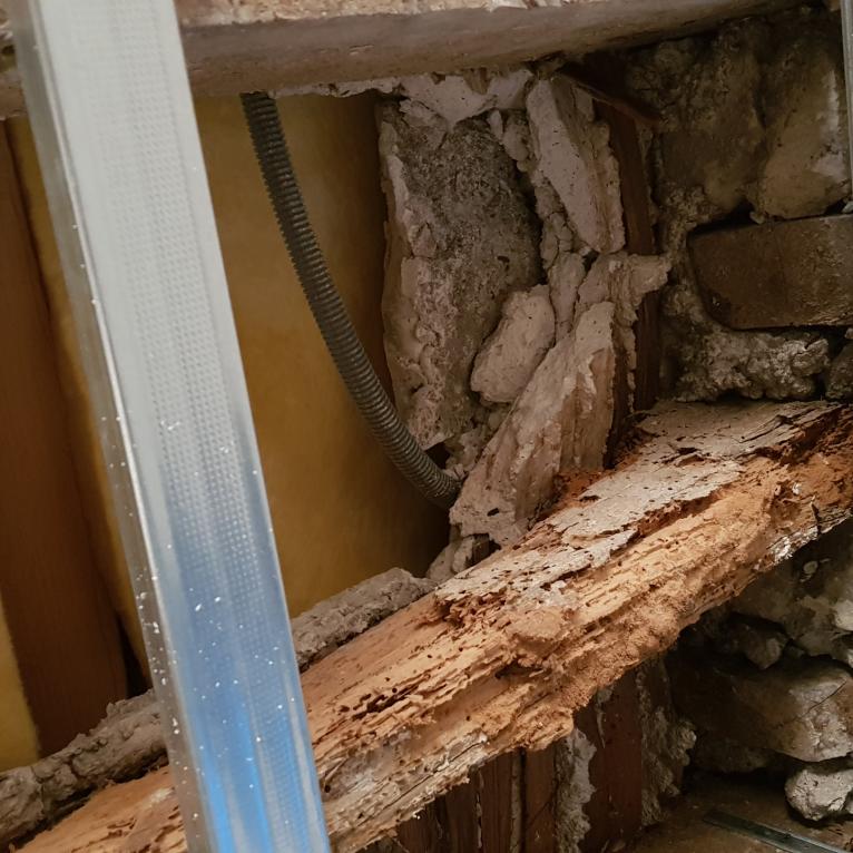 Les équipes Pharmabois se rendent sur site en urgence. Elles constatent une dégradation importante du solivage haut en chêne. Après analyse, il s’avère que dégâts ont été occasionnés par une attaque d’insectes à larves xylophages, créant un affaissement potentiellement dangereux de l’ensemble. Suivant les bonnes pratiques appliquées par Pharmabois pour ce type d’intervention, nos équipes réalisent un étaiement d’urgence avant travaux.